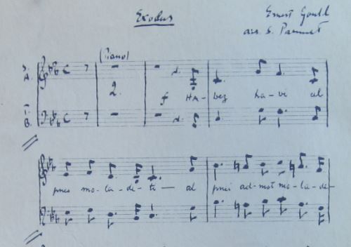 Simon Parmet's manuscript for his choral arrangement of E. Gold's song Exodus.