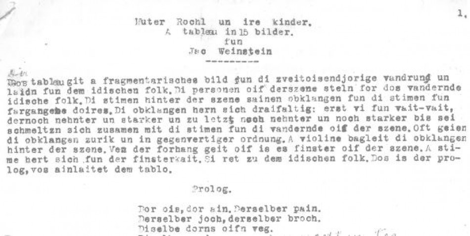 Jac Weinstein’s unpublished manuscript of Muter Rochl un ire kinder: A tableau in 15 bilder (Mother Rachel and her children: A tableau in 15 images) in Latinised Yiddish from c. 1948. The exact date of the tableau is unknown, though some of the drafts accompanying the full script include the year 1948. There are also some later amendments to the script.